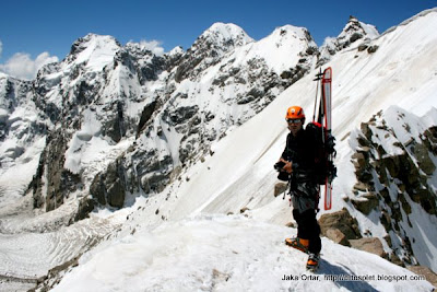 Samo čez krajno poč sva malo bolj morala pogledati, kako in kaj, sicer sva lepo na smučeh dosegla greben med vrhoma Pik Anin in Pik Neizvestniy. Po jutranji toaleti sva se prijela SV grebena in po njem počaaasi napredovala navzgor.